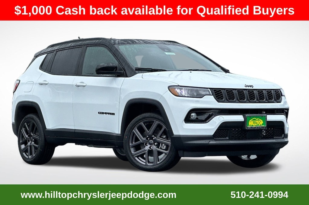 Bright White Clearcoat 2026 Jeep Compass Limited 4WD 8-Speed Automatic 2.0L I4 DOHC 10.1" Touchscreen Display, 4-Wheel Disc Brakes, 6 Speakers, ABS brakes, Air Conditioning, Alexa Built-In, Alloy wheels, AM/FM radio: SiriusXM, Auto High-beam Headlights, Automatic temperature control, Black Day Light Opening Moldings, Brake assist, Cluster 10.25" TFT Color Display, Connected Travel & Traffic Services, Delay-off headlights, Dual front impact airbags, Dual front side impact airbags, Four wheel independent suspension, Front anti-roll bar, Front Bucket Seats, Front Center Armrest w/Storage, Front dual zone A/C, Front fog lights, Gloss Black Surround/Neutral Gray Rings, GPS Navigation, HD Radio, Heated front seats, Integrated Voice Command w/Bluetooth, Limited Altitude Pack, Limited Altitude Pack (DISC), Neutral Gray Exterior Accents, Neutral Gray Exterior Badging, Panic alarm, ParkView Rear Back-Up Camera, Piano Black Interior Accents, Power door mirrors, Power driver seat, Power Front/Fixed Rear Full Sunroof, Power Liftgate, Power steering, Power windows, Premium Alpine Speaker System, Quick Order Package 29W Limited Altitude, Radio: Uconnect 5 w/10.1" Display, Rear window defroster, SiriusXM w/360L, Speed control, Split folding rear seat, Spoiler, Sun, Sound & Nav Group, Wheels: 18" x 7" Painted Diamond Cut Aluminum, Wheels: 19" x 7.5" Aluminum Painted.