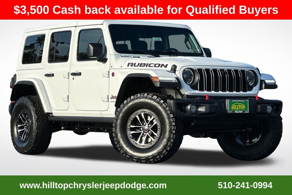 Bright White Clearcoat 2026 Jeep Wrangler Rubicon X 4WD 8-Speed Automatic 3.6L V6 24V VVT 12.3" Touchscreen Display, 35" Tire Suspension, 4-Wheel Disc Brakes, 4G LTE Wi-Fi Hot Spot, 8 Speakers, ABS brakes, Acoustic Front Seat Area Carpet, Acoustic Laminated Front Door Glass, Air Conditioning, Alpine Premium Audio System, AM/FM radio: SiriusXM with 360L, Apple CarPlay, Apple CarPlay/Android Auto, Auto High Beam Headlamp Control, Auto-Dimming Rear-View Mirror, Automatic temperature control, Aux Battery, Auxiliary Switches, Blind Spot and Cross Path Detection, Body Color 3-Piece Hard Top, Body Color Rubicon Highline Flare, Class II Receiver Hitch, Compass, Connected Travel and Traffic Services, Connectivity - US/Canada, Delay-off headlights, Freedom Panel Storage Bag, Front dual zone A/C, Front fog lights, Fully automatic headlights, Google Android Auto, HD Radio, Heated Front Seats, Heated Steering Wheel, Integrated Off-Road Camera, Integrated Voice Command with Bluetooth, Leather Wrapped Park Brake Handle, Leather Wrapped Shift Knob, MOPAR Hardtop Headliner, Nappa Leather Seats, Non-Lock Fuel Cap Without Discriminator, Panic alarm, ParkSense Rear Park Assist System, Performance Suspension, Power 4-Way Driver Lumbar Adjust, Power 4-Way Passenger Lumbar Adjust, Power Adjust 8-Way Driver Seat, Power Adjust 8-Way Front Passenger Seat, Power door mirrors, Power steering, Power windows, Premium Door Trim Panel, Quick Order Package 24Y Rubicon X, Radio: Uconnect 5 Navigation with 12.3" Display, Rear Window Defroster, Rear Window Wiper/Washer, Remote keyless entry, Security system, SiriusXM with 360L, Speed control, Steel Front Bumper, Steel Rear Bumper, Steering wheel mounted audio controls, Stop-Start Dual Battery System, Traction control, Trailer Tow and Auxiliary Switch Group, Trailer Tow Prep Package, Universal Garage Door Opener.